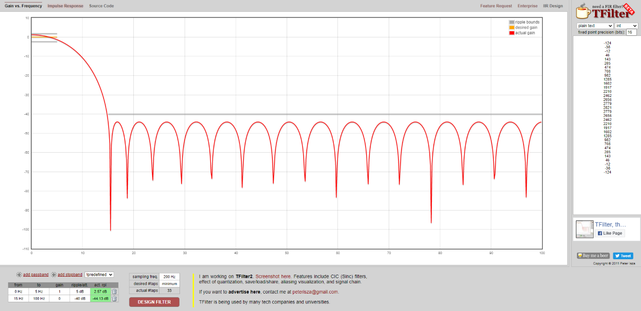 I measured the average run time of control cycle to be aproximately 5000 us (200 Hz). I used this as my design frequency. I implemented the filter using the library mentioned above. To come up with filter coefficents I used the online filter designer TFilter.com (http://t-filter.engineerjs.com/). I tried to keep the pass band very tight since the loss of contacct event I was trying to attenuate could occure at fairly low frequencies 15-20 Hz. To reduce the number of coefficents required, I allowed for a fairly shallow cutoff. The following image shows the gain vs frequency plot of my filter along with its parameters.